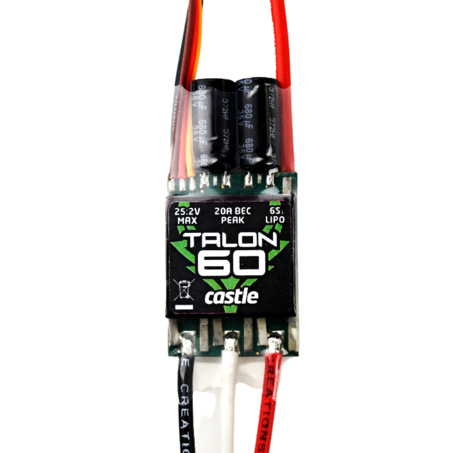 The compact layout and slim profile of the Talon 60 is also perfect for SCALE, SPORT and AEROBATIC PLANES in the .32 - .60 range requiring up to 1400 watts on 6S. With its 20 AMP PEAK POWER and 8 AMPS OF CONTINUOUS POWER, it will keep even the most draining servos at ease.