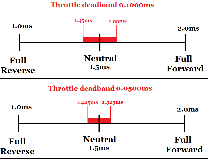 Throttle Deadband - Affects the “window” that the ESC sees as neutral. A larger deadband will create a dead spot in the trigger. When you slowly apply throttle the ESC will still consider it to be neutral. A smaller value reduces that window and allows the ESC to react sooner on the trigger position. (See Throttle Deadband illustration below)